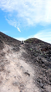 Here there’s a bit of a scramble up some loose lava scree, and the footing’s not so easy. Then you’re inside the cone, with your choice of three more scrambles to get up to the rim. (All this is very clearly seen on Google Earth: do a search for “Amboy Crater” and put a slight tilt to the view.)